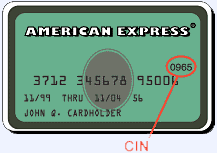 | The American Express Card Identification Number (CIN) is a four digit number found on the front of the U.S. issued American Express Card (including Optima). For the American Express card the four digit number is displayed on the front of the card, just above and to the right of the credit card number. For the Optima card it is displayed on the front of the card, to the left and just above the credit card number. American Express and DrLaura.com are now using this number for added security and customer protection. |