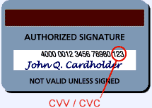 | This is a security code that protects your credit card from possible fraud. The CVV (Card Validation Value) on the VISA, the CVC (Card Validation Code) on the MasterCard, or the CIN (Card Identification Number) on the American Express card, is a 3 or 4 digit code that can usually be found on the back of your credit card. |